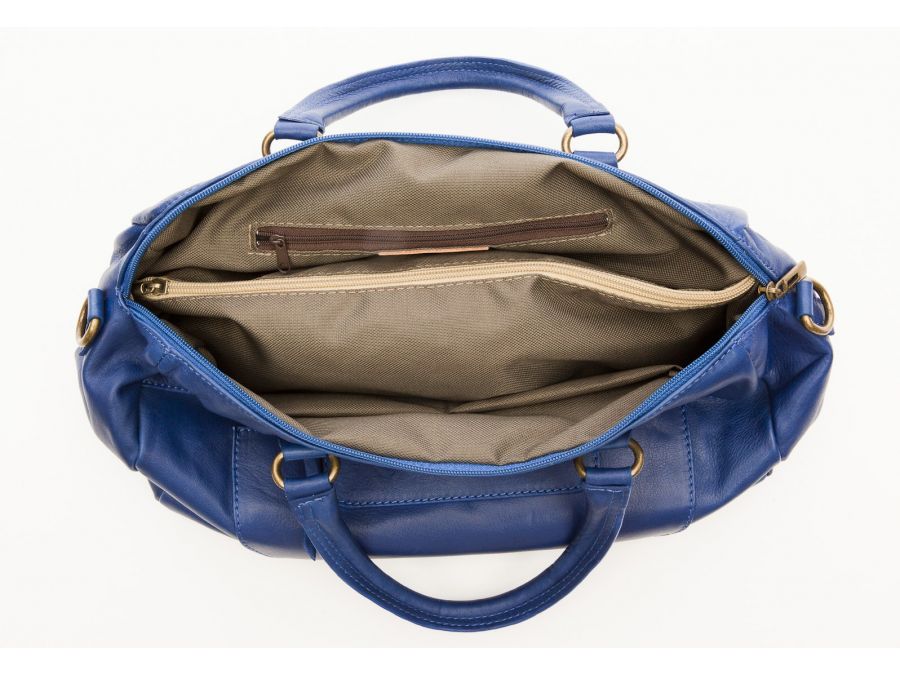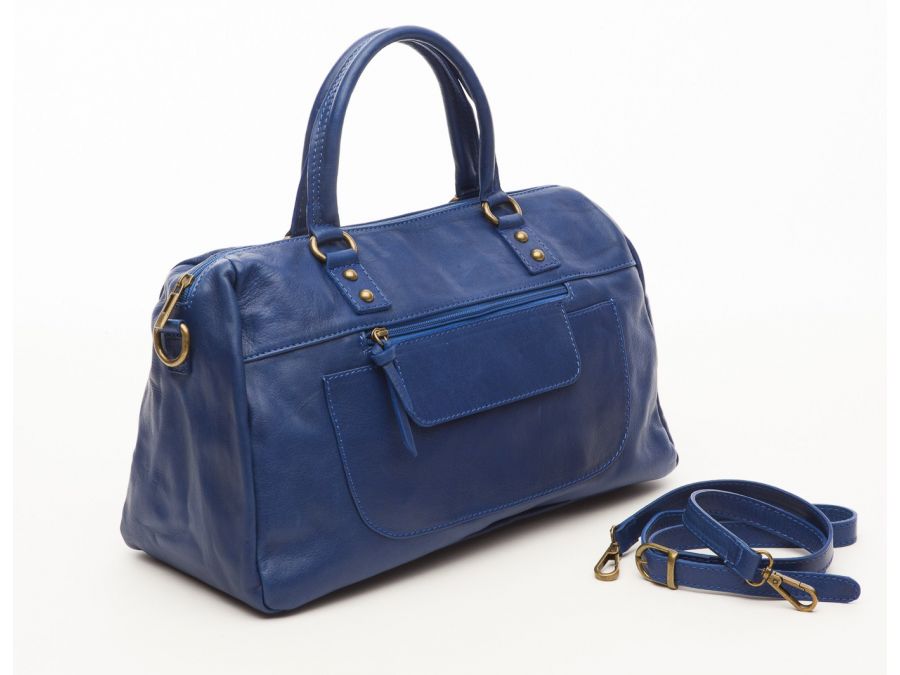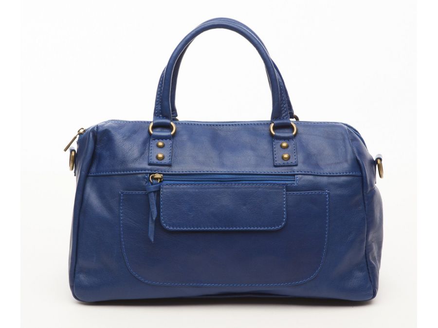 Sac cuir souple porté main bleu. Il possède une bandoulière et dispose d'une poche intérieure et extérieure fermant grâce à un zip.
