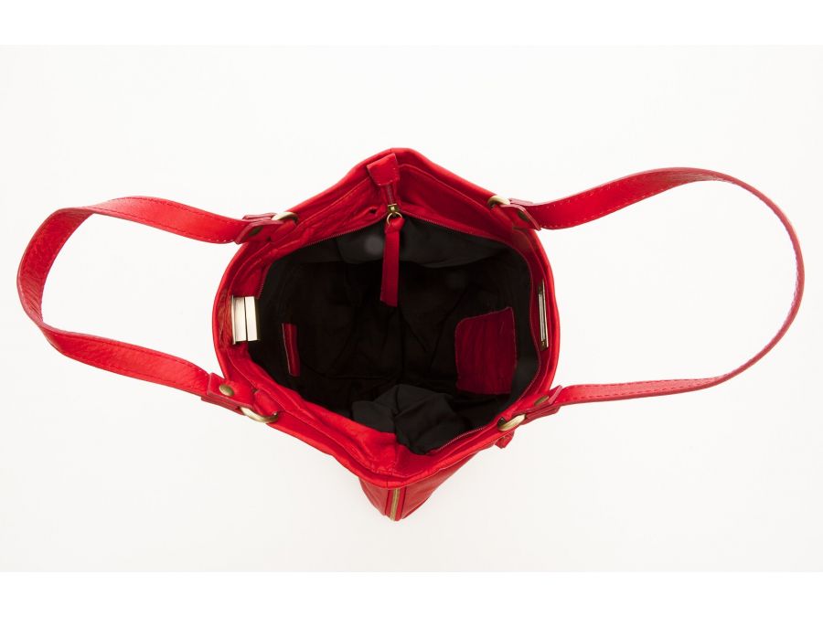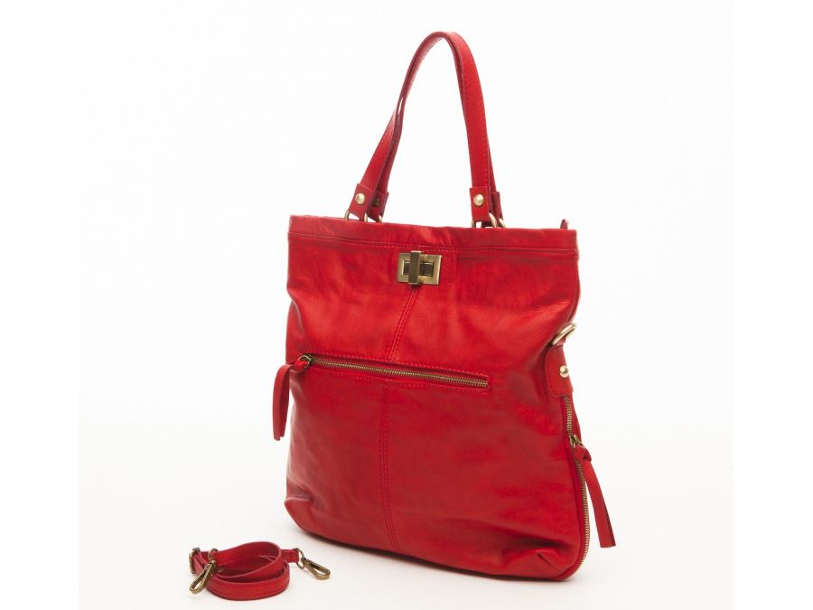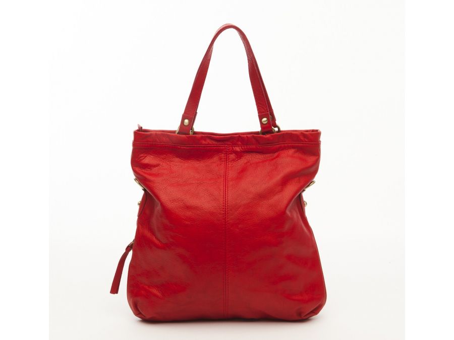 Sac cuir souple porté main rouge. Il possède une poche extérieure sur un de ses côtés.