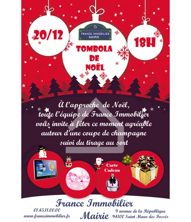 A l'approche de Noel toute l'équipe France Immobilier vous invite à participer à sa Tombola. Venez discuter de votre futur projet. Un coupon vous sera remis entre le 1er et le 16 décembre afin de participer au tirage au sort du 20 décembre qui se fera autour d'une coupe de Champagne. 300 tickets disponibles.