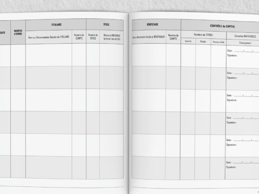 Grâce à ce registre, des mouvements de titres, inscrivez l'ensemble des mouvements des actions pour les acquisitions et les cessions en respectant vos obligations légales, le tout sur un support soigné et un large format pour un confort d'écriture et de lecture.