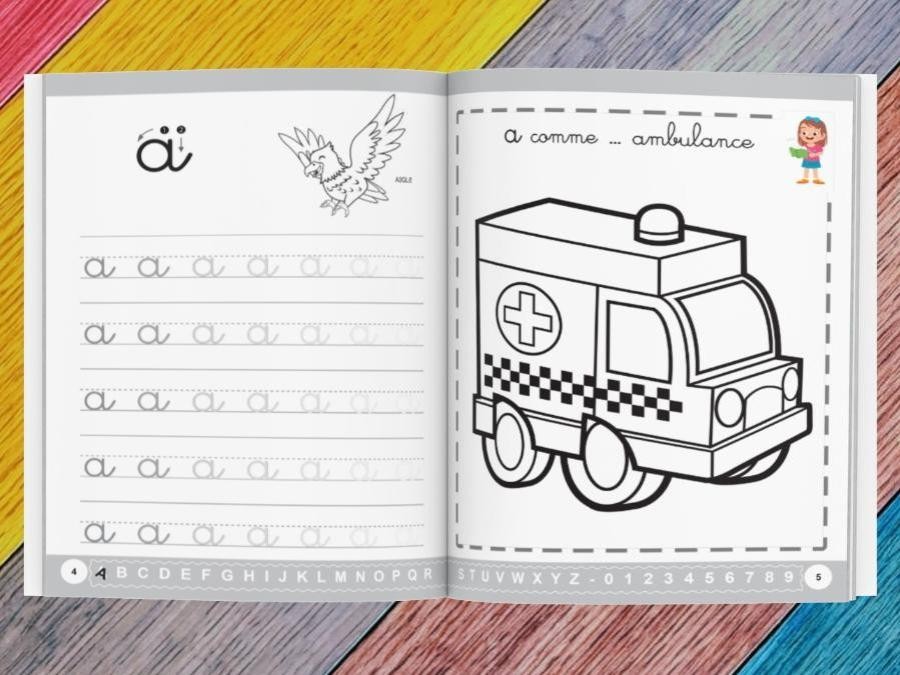 - 1 page avec un beau dessin à colorier pour chaque lettre