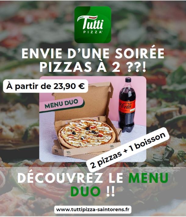 Amateurs de pizzas, c'est le moment de vous faire plaisir ! Chez Tutti Pizza à Saint-Orens de Gameville, découvrez notre offre exclusive : le menu duo. Profitez de 2 pizzas 27 cm au choix + 1 boisson grand format à partir de 23,90 €. Vous préférez une pizza plus grande ? Optez pour la version 33 cm avec un supplément de seulement 3 €.