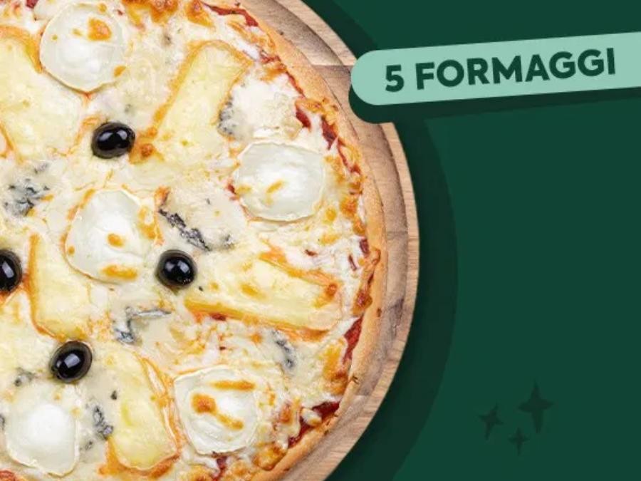 Embarquez pour un voyage gustatif hors du commun avec la 5 Formaggi. Sa base de sauce tomate sert d'écrin à un mélange harmonieux de cinq fromages. L'emmental français et la mozzarella française offrent une texture filante, tandis que le fromage de chèvre ajoute une note piquante. Le gorgonzola AOP et le reblochon AOP fusionnent pour une richesse inégalée, agrémentée d'olives pour une petite touche méditerranéenne. Et pour une finition sucrée-salée, un filet de miel est soigneusement versé après cuisson. Choisissez entre ses tailles de 27cm ou agrandissez votre plaisir avec 33cm pour seulement +3,00€ supplémentaires.