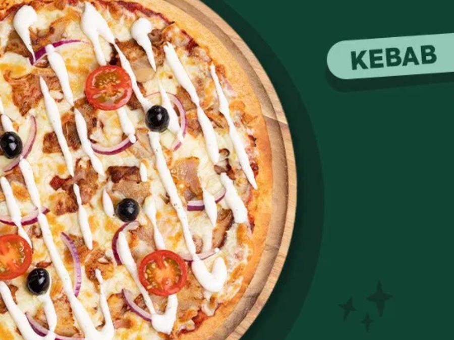 Sauce tomate, mozzarella française, viandes de kebab, oignons rouges, tomates cerises, olives – Après cuisson : sauce blanche.