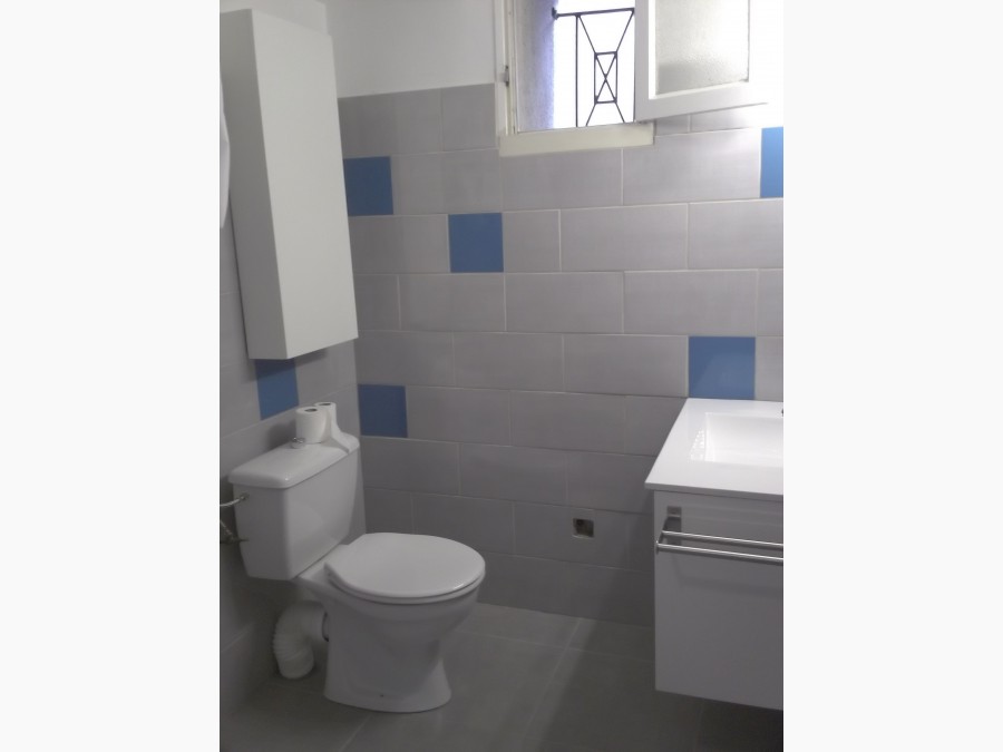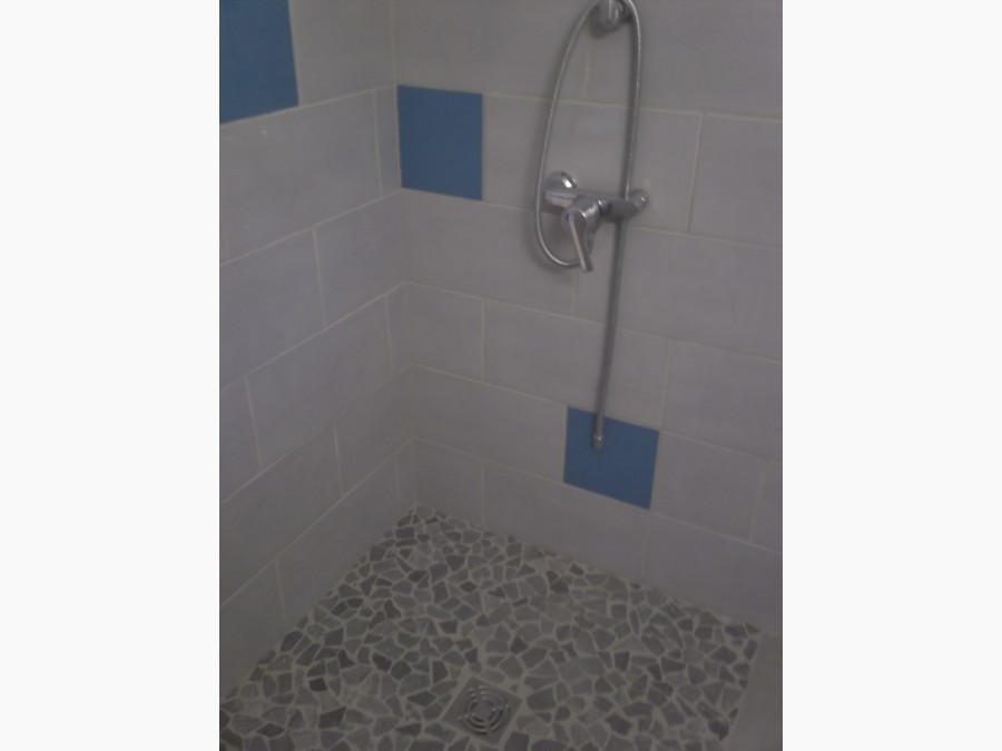 Salle d'eau avec WC, cuisine en partie équipée (hotte + plaque vitrocéramique), buanderie, cellier.